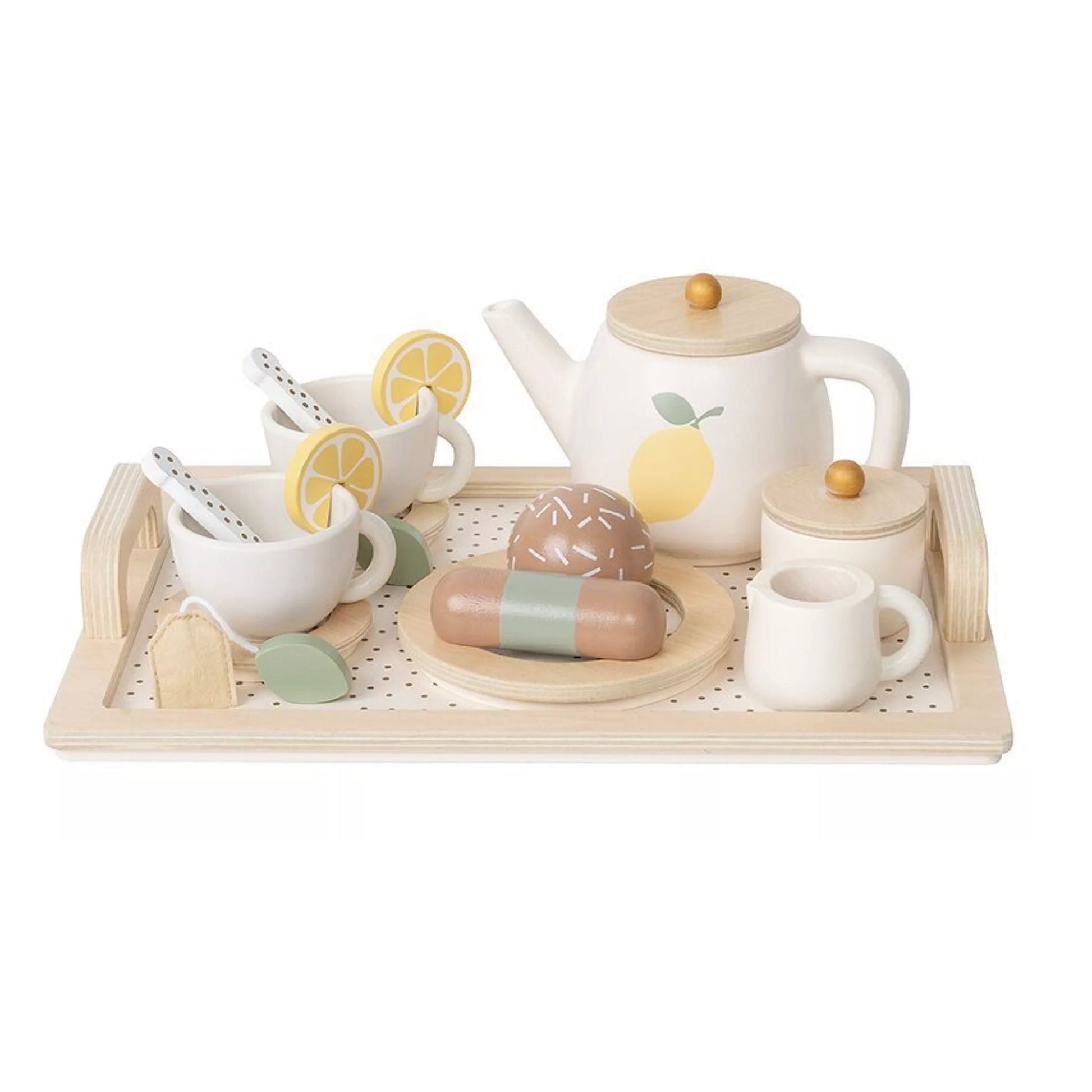 Offrez à vos enfants un moment de jeu créatif et amusant avec cet ensemble de service à thé en bois. Ce jouet d'imitation inclut une théière avec couvercle, deux tasses avec des tranches de citron décoratives, des cuillères, un pot à sucre, une carafe à lait et des pâtisseries gourmandes. Le tout est présenté sur un plateau en bois à poignées pour un transport facile.